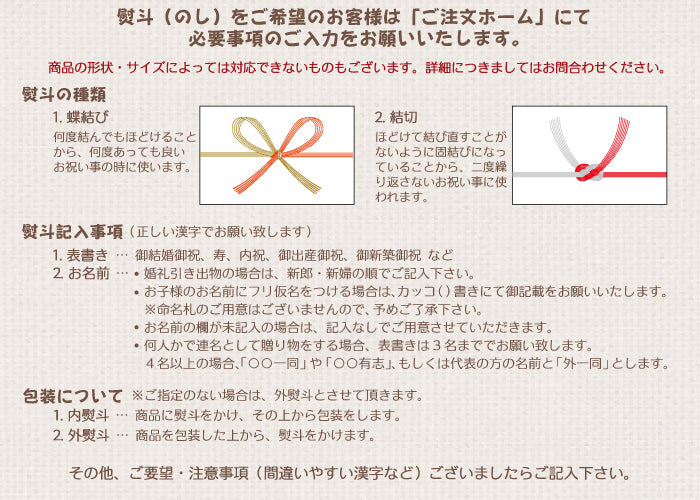 ご注文が2点以上の場合は「まとめて包装」または「個別包装」などを注文メモの備考欄にてお申し付けください。