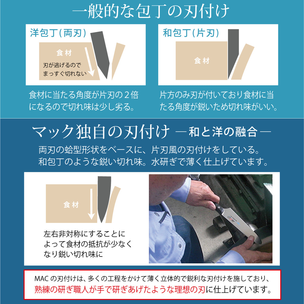 家庭用で一番よく使われる万能包丁。 ブロック肉の切り分けや刺身の引き切りに便利な形状の包丁。 刃渡りが長いので野菜やパンなど様々な用途に使えます。 【約全長29×刃渡り16.5㎝】【刃付け:両刃(右利き、左利き)】【MAC全商品化粧箱入】