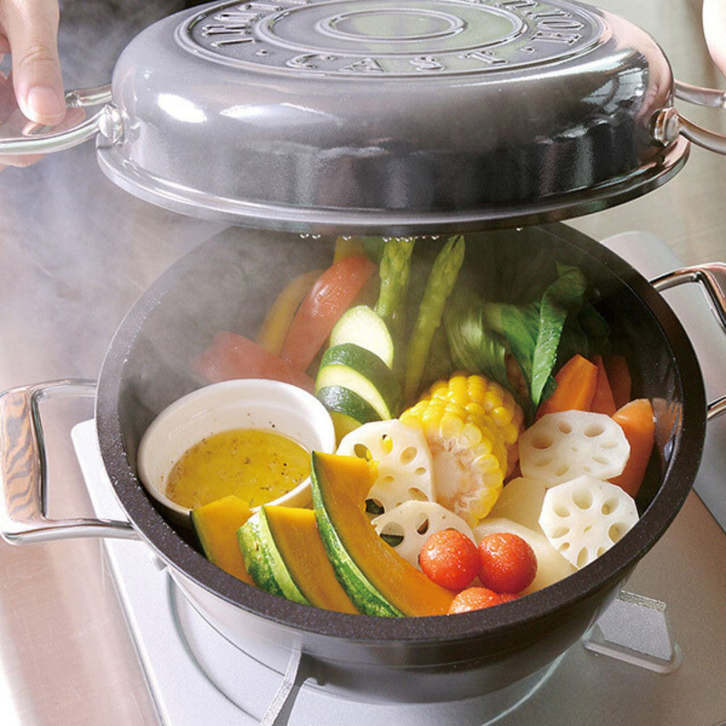 炊く・煮る・蒸す・茹でる・揚げる・炒める・焼く・オーブン調理(天火)と、1台で8通りの使い方ができます。機密性の高い蓋のおかげで無水調理までこなします。※【お取り寄せ商品】の為、 土日祝と臨時休業を除く4~7営業日以内に発送致します。メーカー欠品など御座いましたら、一度ご連絡させて頂きます。