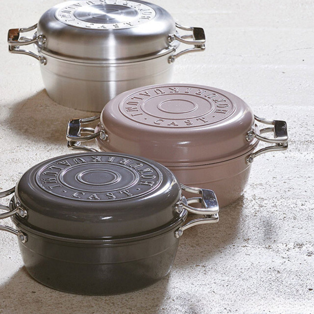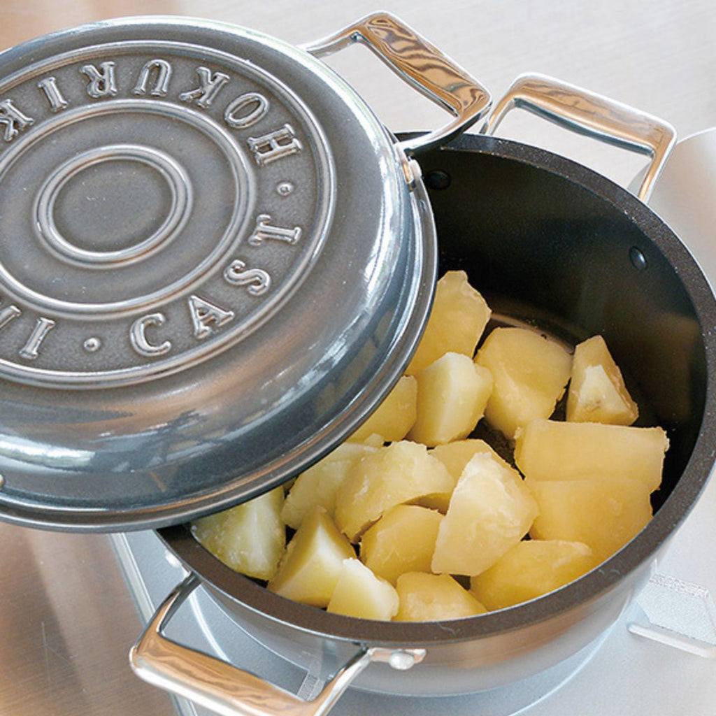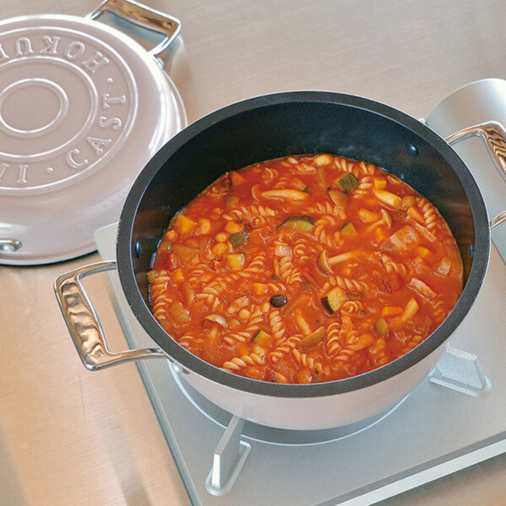 素材そのもののうまみをじっくり引き出す、鋳物鍋の長所とアルミならではの「軽さ」を掛け合わせ、 汚れにくさ、洗いやすさにも、とことんこだわり抜きました。