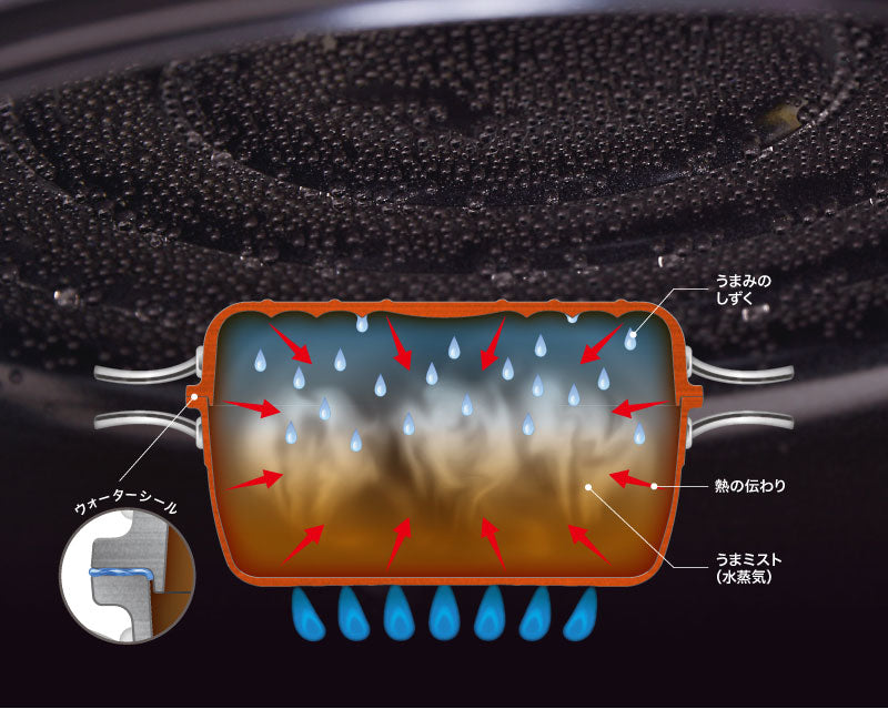 加熱すると食材の持つ水分は、うまみと栄養のギュッとつまったミスト、「うまミスト」となり、鍋の中を循環します。
