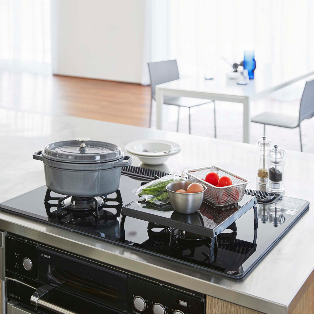 収納・作業スペースになるコンパクトでサッと使えるガスコンロカバー。単身者からファミリーまで幅広く使えます。キッチンの作業スペースが多く使える便利グッズです♪