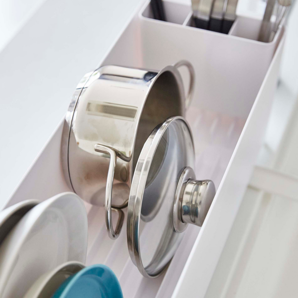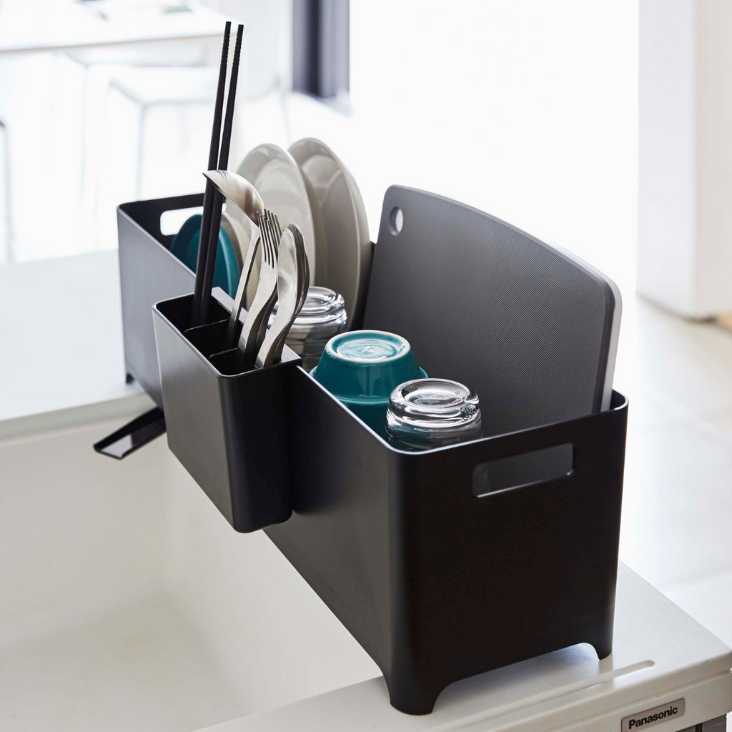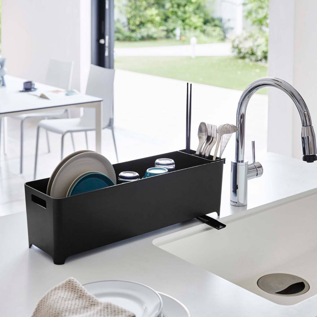 狭い場所にも置ける、スリムで長い水切りカゴです♪ 1人暮らしの方やキッチンを広く使いたい方にオススメです。 おしゃれなキッチンにも馴染むシンプルなデザインで、 スッキリと食器を水切りできます。